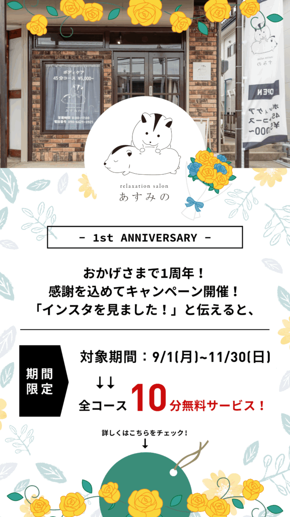 2025.09.08 2025.11.09 -1st anniversary- おかげさまで1周年!感謝を込めてキャンペーン開催!「インスタを見ました!」と伝えると、全コース10分無料サービス! よろしくお願いします😊✨ ツボのリール動画のご紹介! 前の記事 あけましておめでとうございます。 次の記事